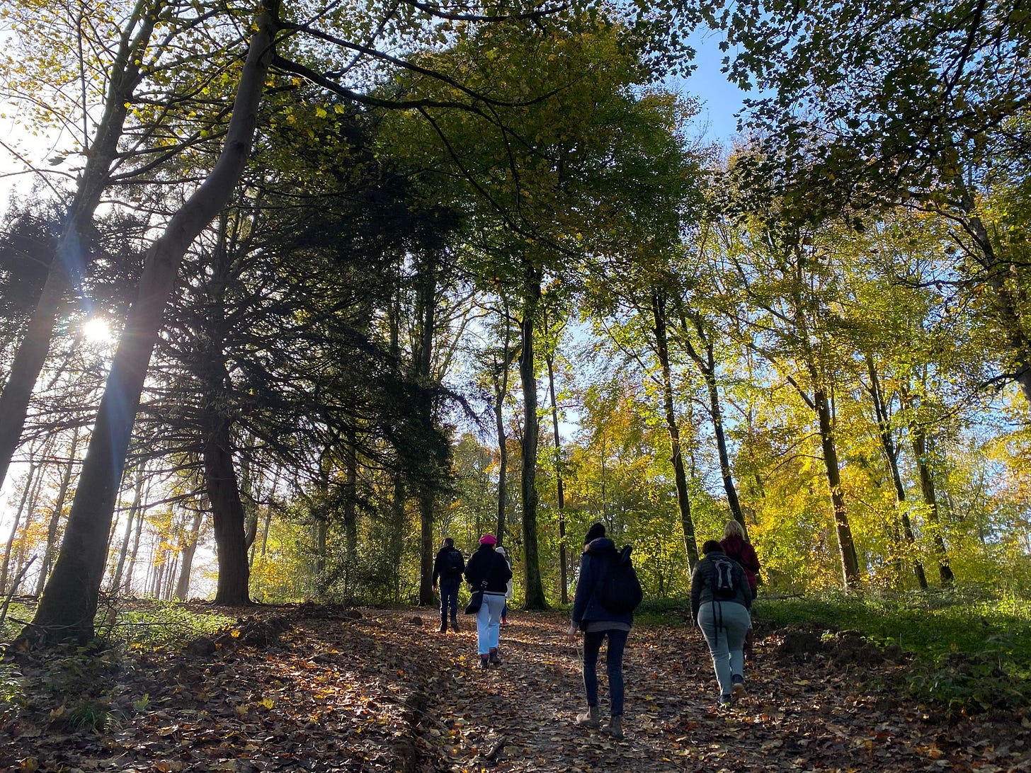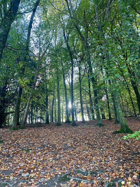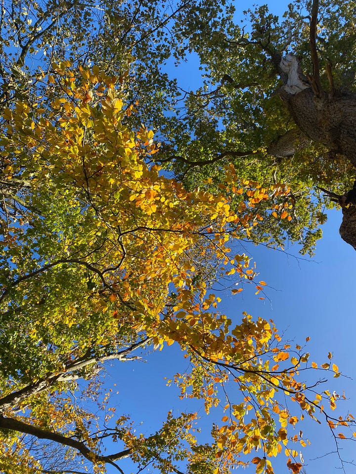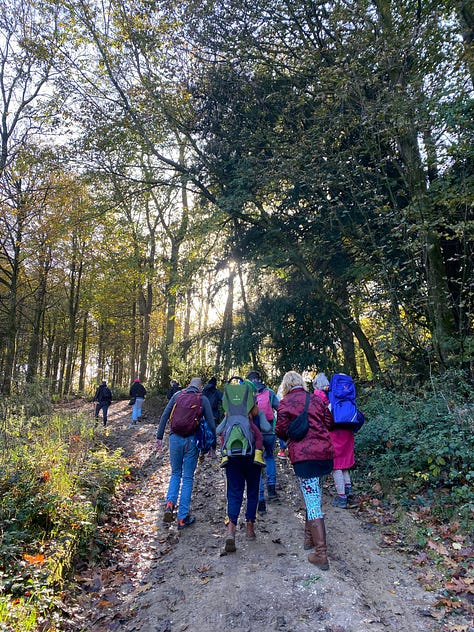 This weekend, I marked Samhain with friends and friends of friends by organising an Autumnal walk in Stanmer Park. It felt so nourishing. The sun shone and 16 humans gathered, much to my delight! Thanks to friends sharing their gifts, we walked, we sang, we had time in silence, we remembered loved ones deceased, and shared a poem. One thing I particularly loved was lying on the ground and looking up at abundant golden colours against a blue sky. Something is emerging for me and I’m not quite sure what it is yet.