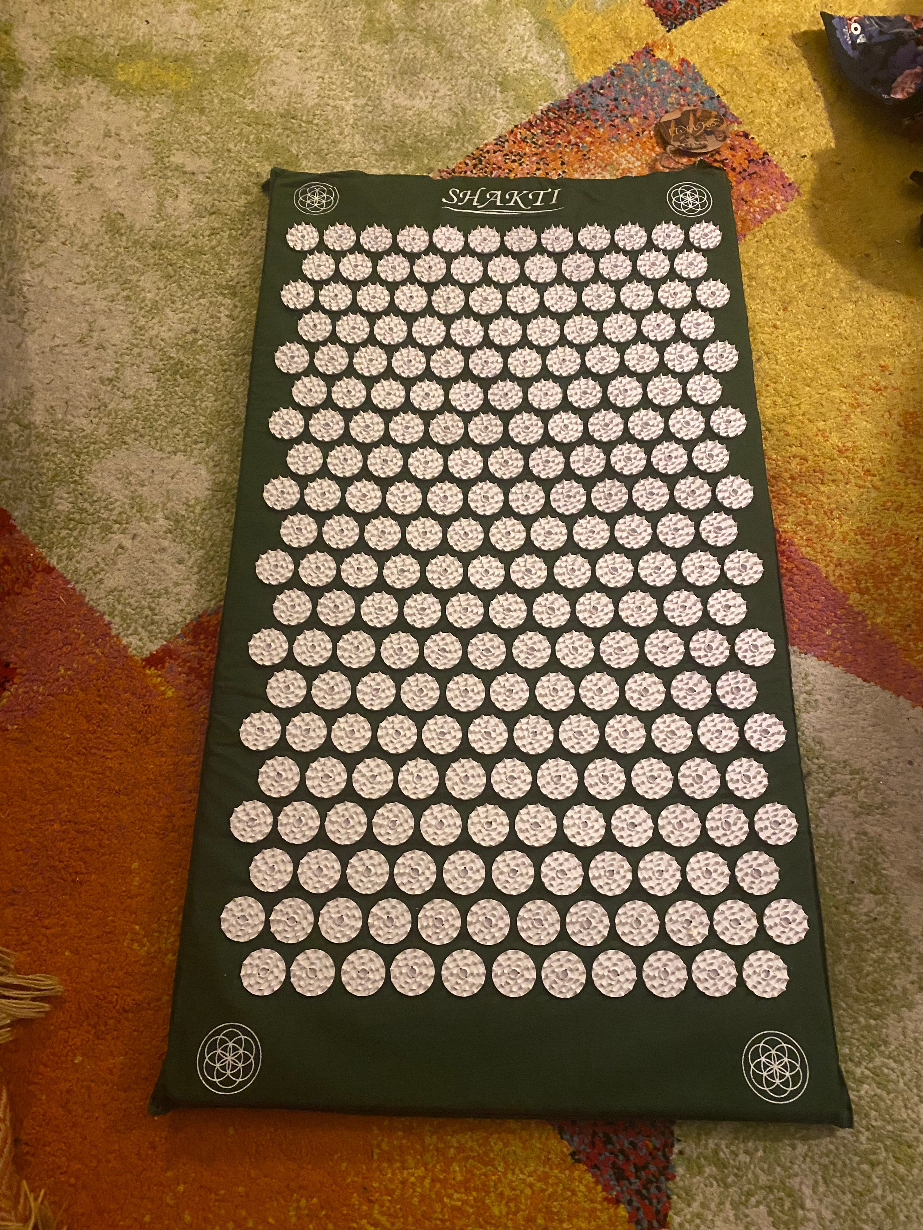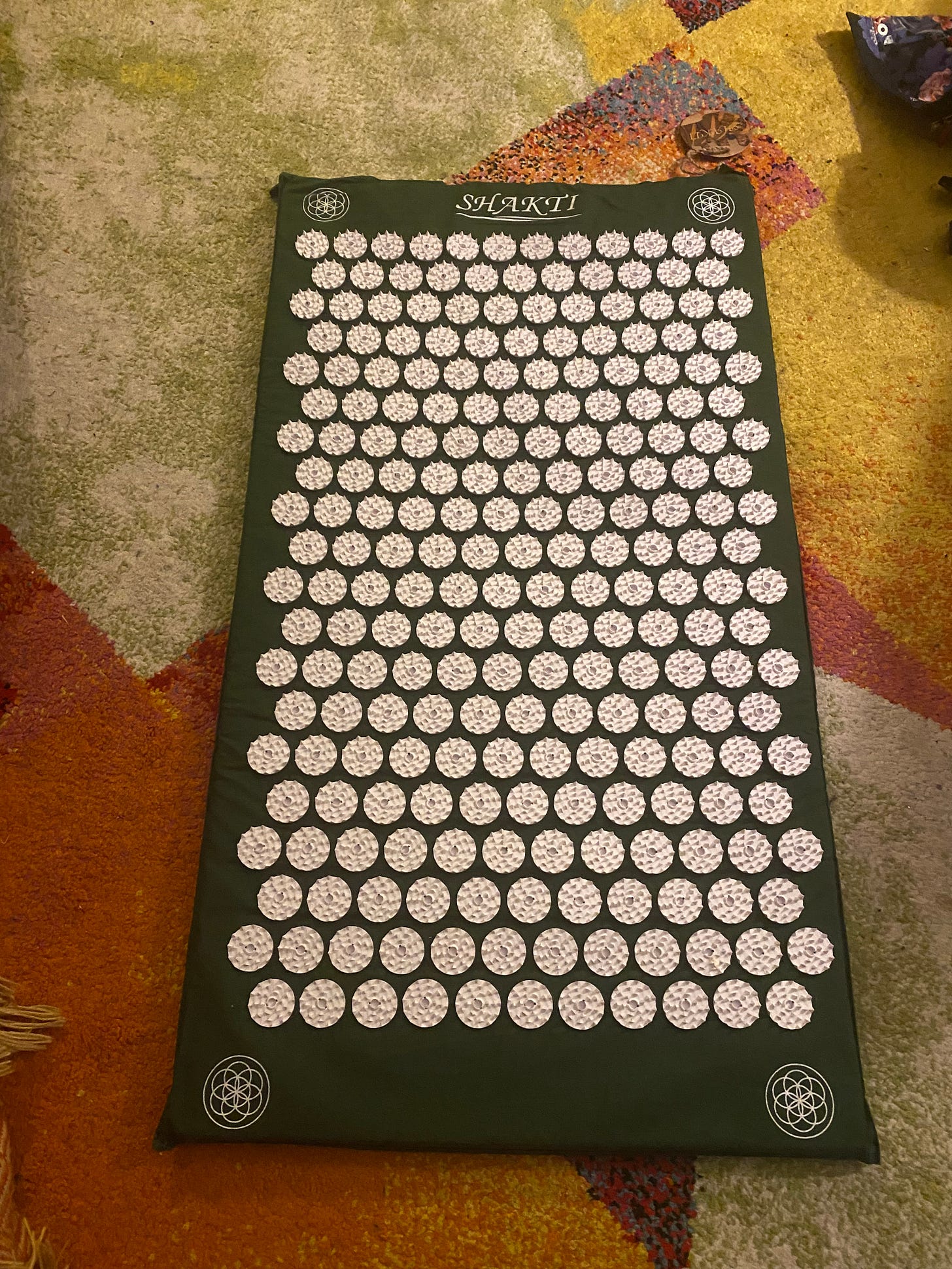 As a reward for finishing my course, I treated myself to a Shakti mat, which gives the experience of acupressure because it’s covered in little spikes.